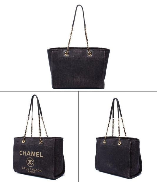 Chanel Tote Shoulder Gold Mixed Fiber Deauville