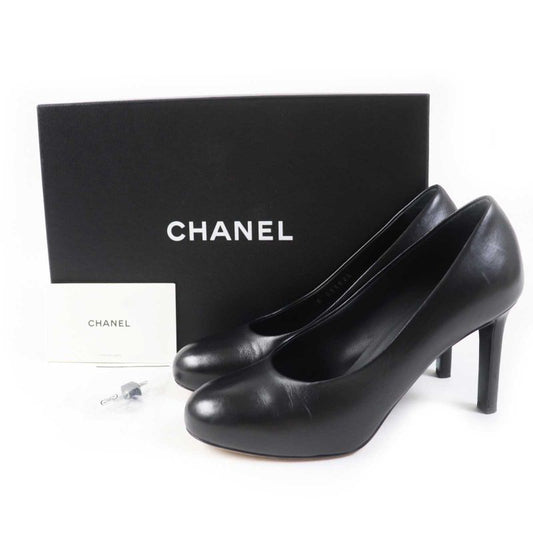 CHANEL G35025 Round Toe Leather Pumps With Coco Mark Black Gold Hardware 36