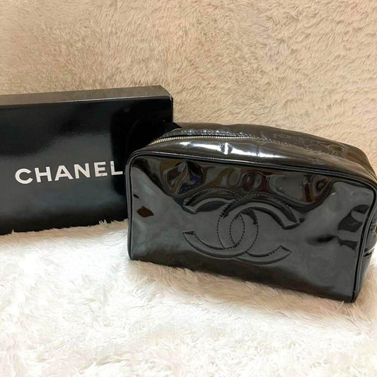 CHANEL CC Patent Leather Vanity Cosmetic Makeup Case Pouch Black Bag