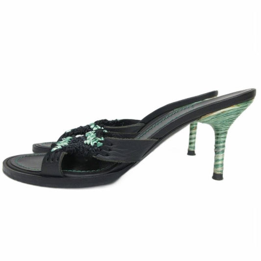 Bottega Veneta Heels Leather Sandals Mules Straw Raffia 37.5 Black Green Ibo86
