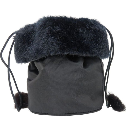 Celine Pouch Drawstring Fur Nylon Black Gold Hardware Logo Circle Small Bag