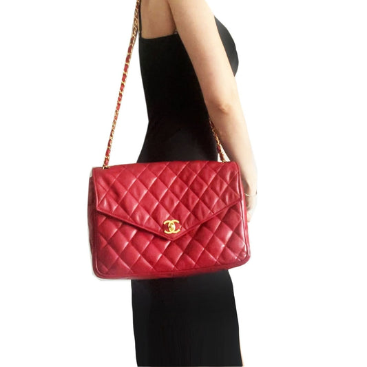 Chanel CC 24k Vintage Jumbo Envelope Flap Bag Lambskin Timeless Red