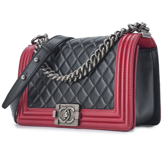 Chanel Boy Chanel Matelasse Chain Shoulder Lambskin Black And Red (silver