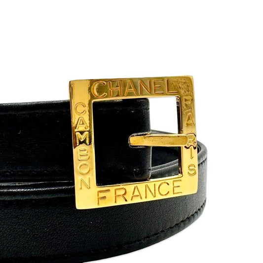 CHANEL Vintage Cambon Logo Black Leather Belt Gold Square Buckle