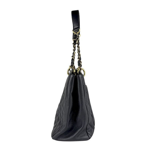 Authentic Chanel Gst Caviar Grand Shopping Tote Quilted Shoulder Bag Black Chain