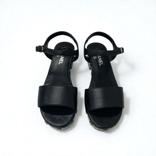 Chanel Sandals Shoes Leather Black Silver Coco Mark Camellia Strap