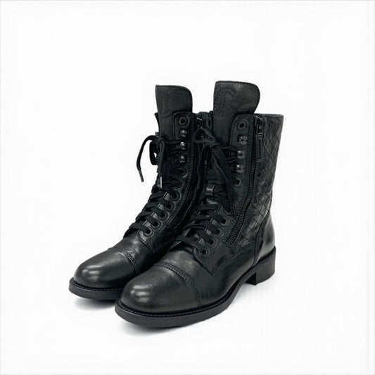 Chanel Boots Short Boots Shoes Leather Black Coco Mark Matelasse Logo Lace-up