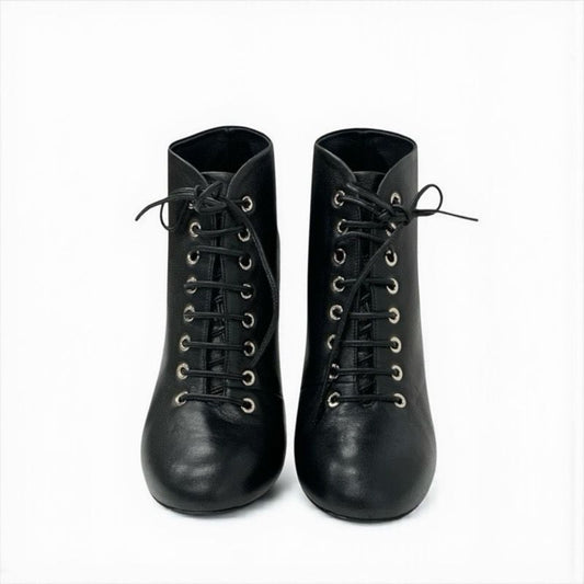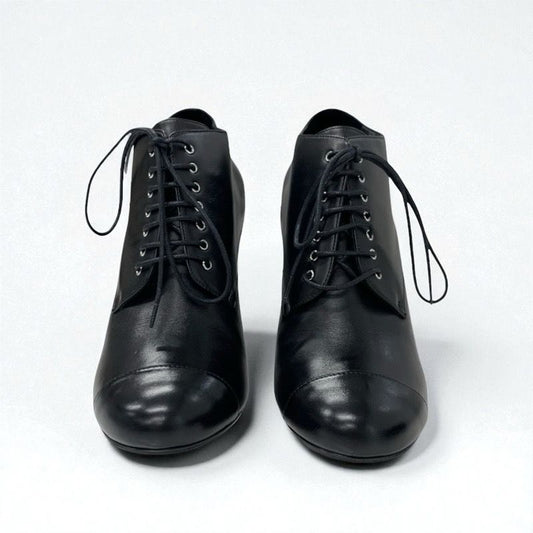 Chanel Boots Short Boots Shoes Leather Black Booties Lace Up Coco Mark Pearl