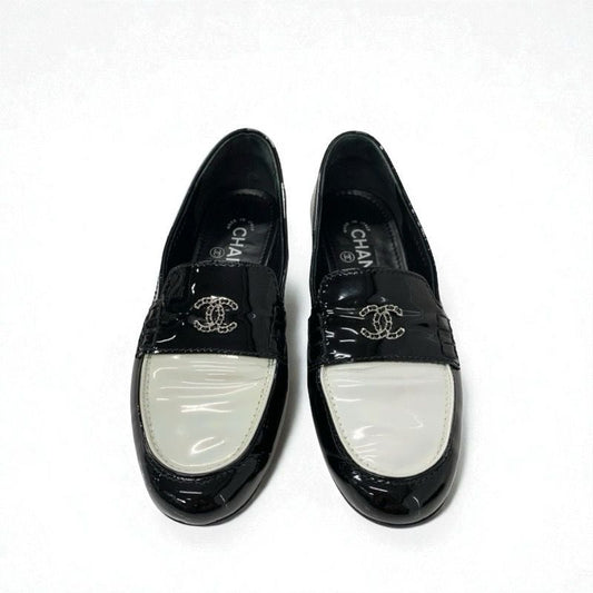 Chanel Loafers Leather Shoes Patent Black White Silver Here Mark Chain Flat