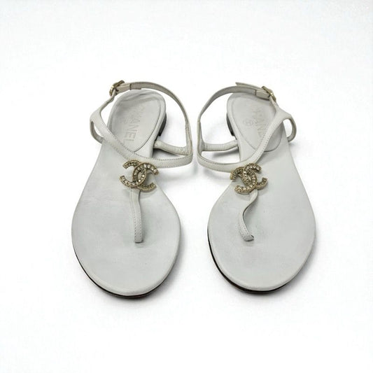 Chanel Sandals Shoes Leather White Gold Coco Mark Rhinestone Strap Thong
