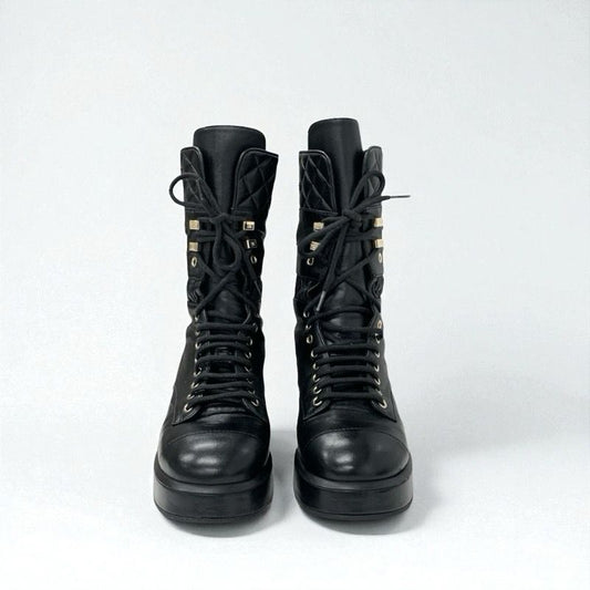 Chanel Boots Short Boots Shoes Leather Black Here Mark Matelasse Lace Up Middle