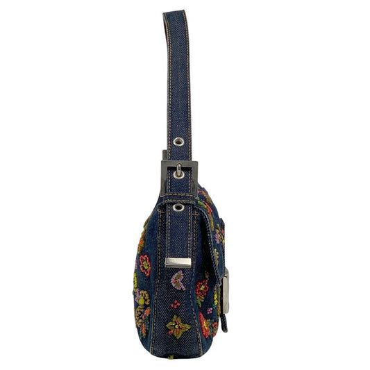 Fendi Zucca Logo Mamma Bucket Beaded Embroidered One Shoulder Bag Denim Blue