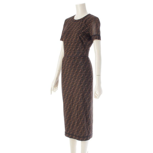 Fendi 19 Nylon Zucca Pattern Short Sleeve Crew Neck Long Dress Brown 38