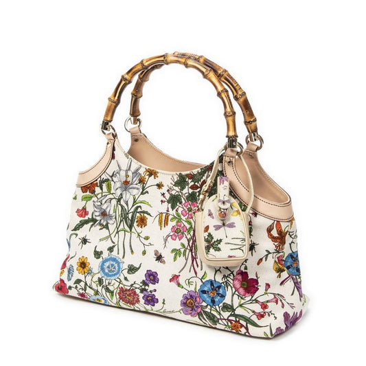 Gucci Medium Floral Bamboo Top Handle Ivory Beige Floral Canvas A