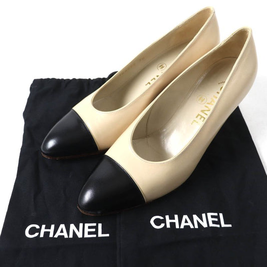 CHANEL Vintage Almond Toe Bicolor Leather Pumps Beige Black 36