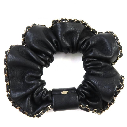 CHANEL A22 Leather Chouche With Coco Mark Chain Hair Accessory Black Gold