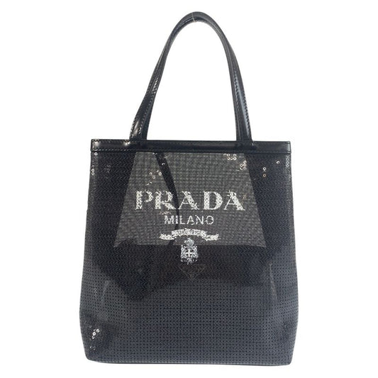 Prada Mesh Triangle Logo Plate Black Silver Hardware Sequins Leather Tote