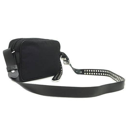 Prada Shoulder Bag Studded Nylon Leather Black Silver Hardware Black Triangle
