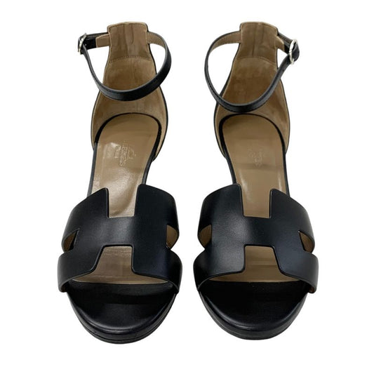 Hermes Legend Sandals Shoes Leather Black Ankle Strap Wedge Sole