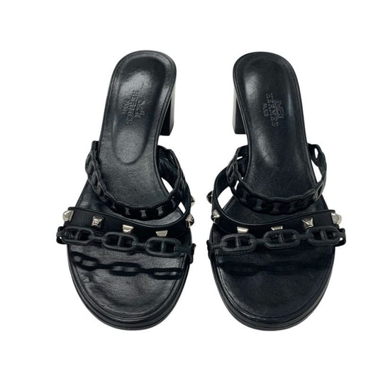 Hermes Aggaccio Sandals Shoes Leather Black Silver Chaine D'ancre Studded Mules