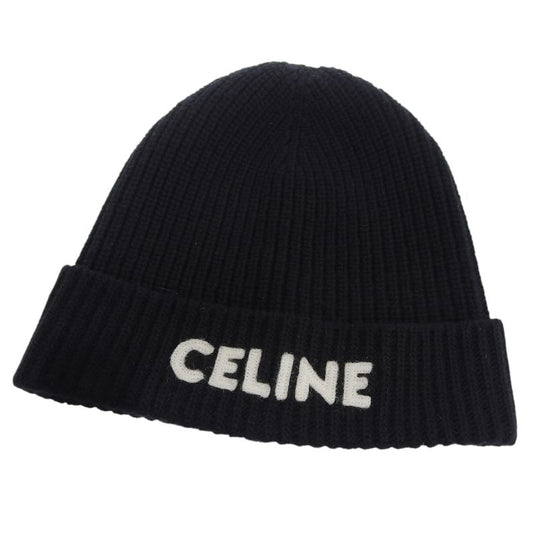 Celine 2a25r535q 100% Wool Felt Logo Hat Knit Cap Black TU Made In Italy