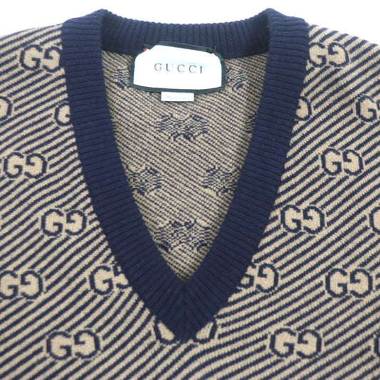 Gucci 626643 Wool Cashmere GG Jacquard V-neck Knit Sweater Brown Navy XS Made