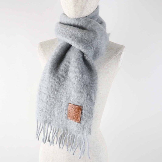 LOEWE Mohair Wool Anagram Leather Patch Fringed Scarf Light Gray Made In Spain
