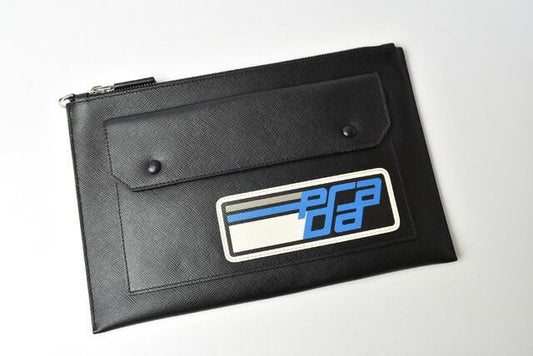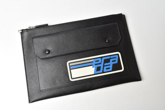 Prada Clutch Bag Travel Pouch Men's Prada Saffiano Patch Patchwork Black Azzurro