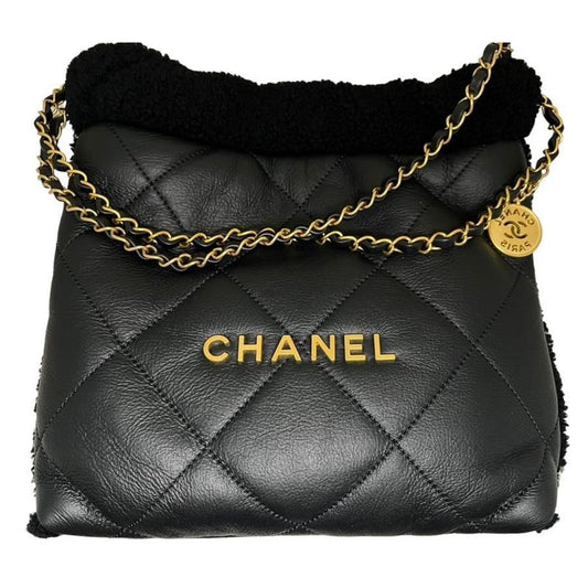 Chanel 22 Small Handbag Chain Bag Shearling Aged Lambskin Black Gold Hardware