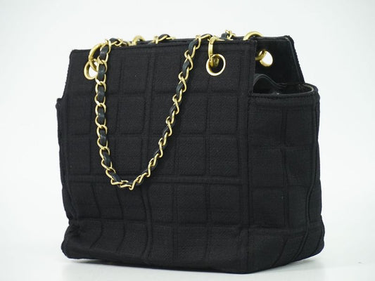 Authentic Chanel Chocolate Bar Chain Shoulder Bag Tote Bag Canvas Black