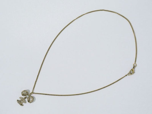 Authentic Chanel Coco Mark Ribbon Motif Rhinestone Necklace Pendant GP Gold