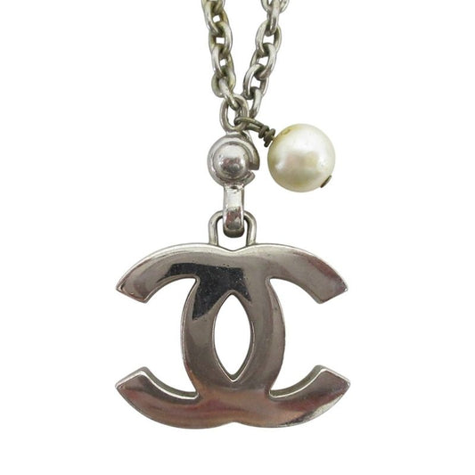 Good 02C Chanel Vintage Faux Pearl Coco Mark Charm Silver Color Ladies Used