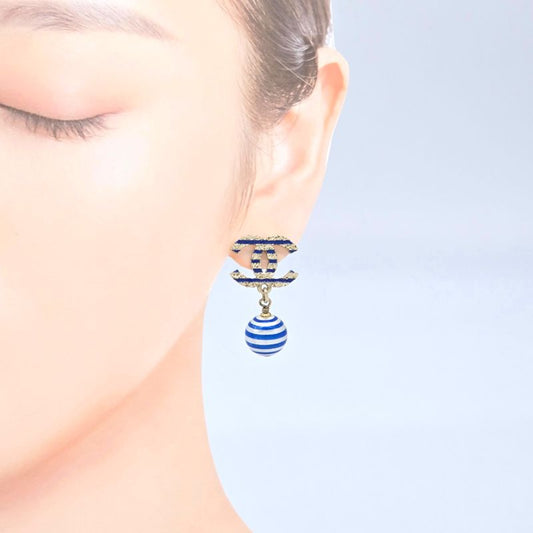 Chanel Coco Mark Earrings Binaural Ball Drop Border Blue/silver Color Gold