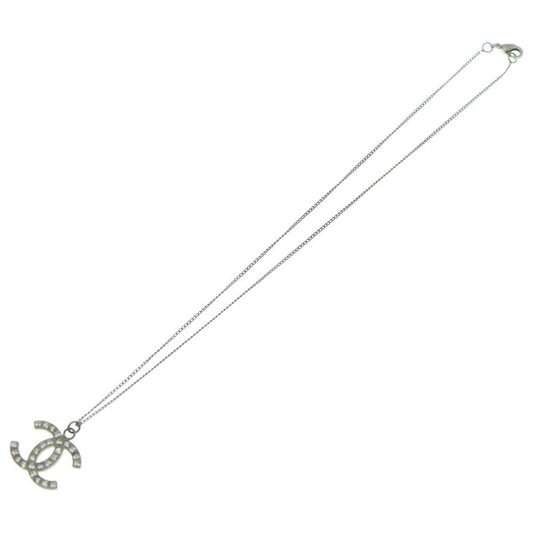 Chanel Necklace Coco Mark Metal Faux Pearl Rhinestone Silver Ladies