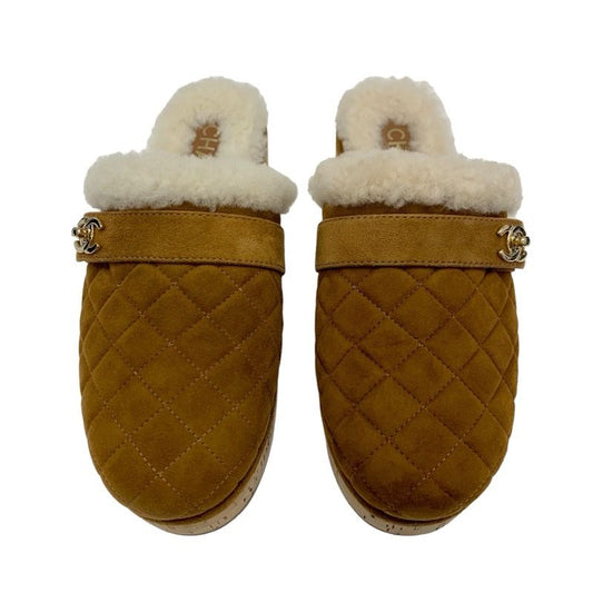 Chanel Sandals Shoes Suede Mouton Cork Brown Gold Sabot Mule Turnlock Coco Mark