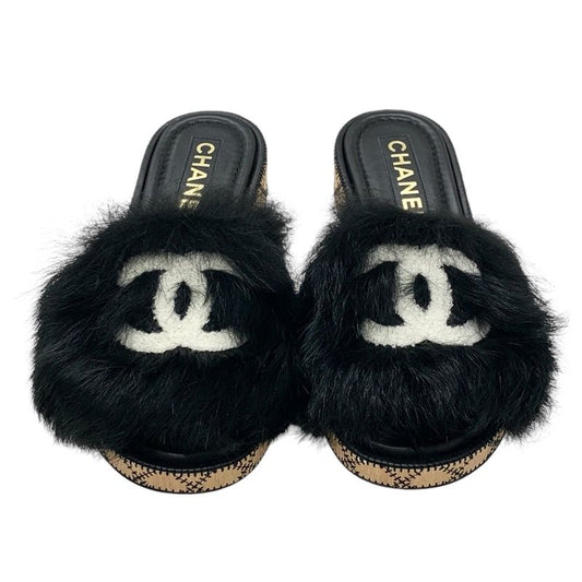 Chanel Sandals Shoes Fur Black White Black Here Mark Mules