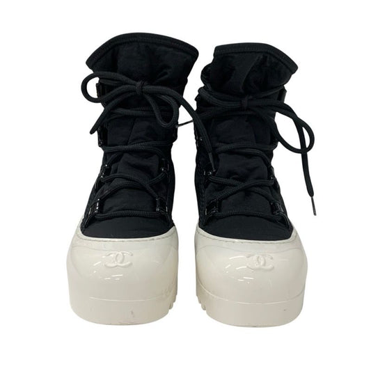Chanel Boots Short Boots Shoes Nylon Patent Black White Here Mark Lace Up