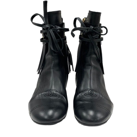 Chanel Boots Short Boots Shoes Leather Black Here Mark Fringe