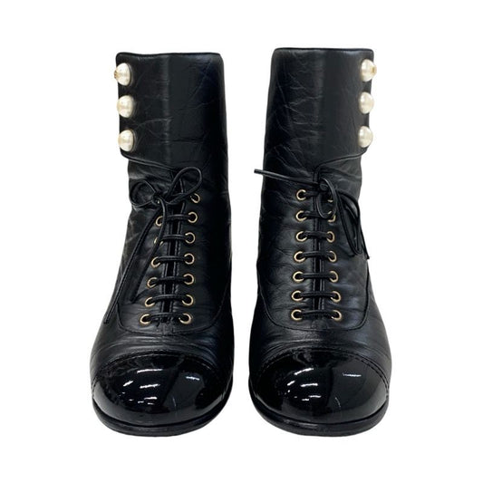 Chanel Boots Short Boots Shoes Leather Black Coco Mark Pearl Lace Up Wrinkle