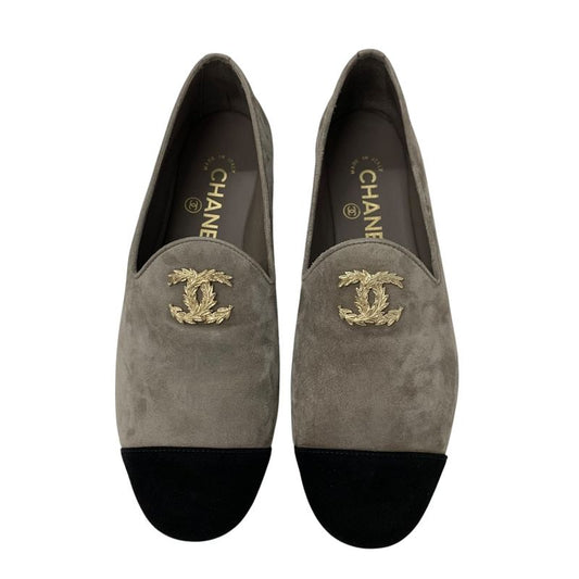 Chanel Flat Shoes Suede Gray Black Gold Here Mark Loafers