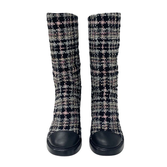Chanel Boots Long Boots Shoes Tweed Leather Black Multicolor Black Here Mark