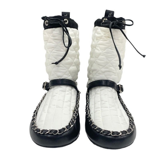 Chanel Boots Short Boots Shoes Nylon Leather White Black Matelasse Chain Belt