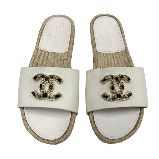 Chanel Sandals Shoes Leather White Gold Flat Sandals Coco Mark Colored Stone