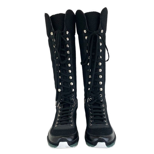 Chanel Boots Long Boots Shoes Tweed Leather Black Lace Up Here Mark Lame