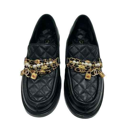 Chanel Loafer Leather Shoes Leather Black Gold Here Mark Chain Matelasse Pearl