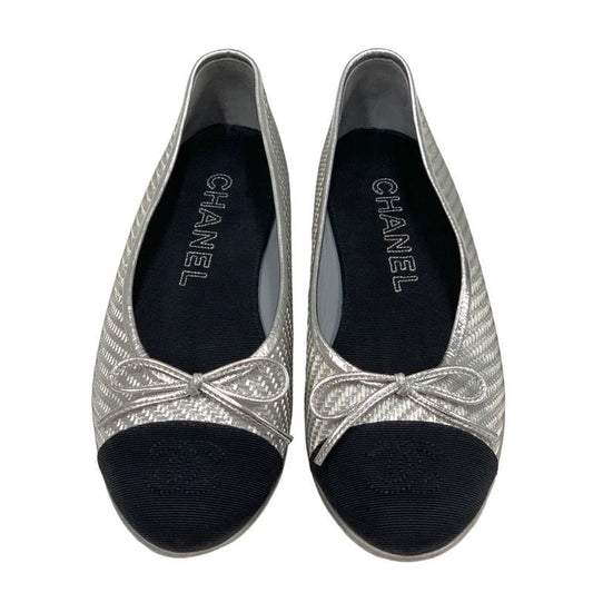 Chanel Flat Shoes Leather Fabric Silver Black Ballet Shoes Coco Mark Ribbon
