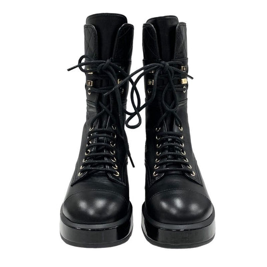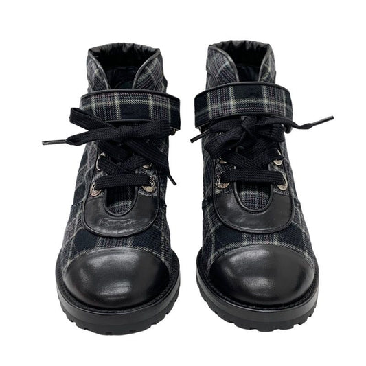Chanel Boots Short Boots Shoes Check Lace Up Fabric Leather Black
