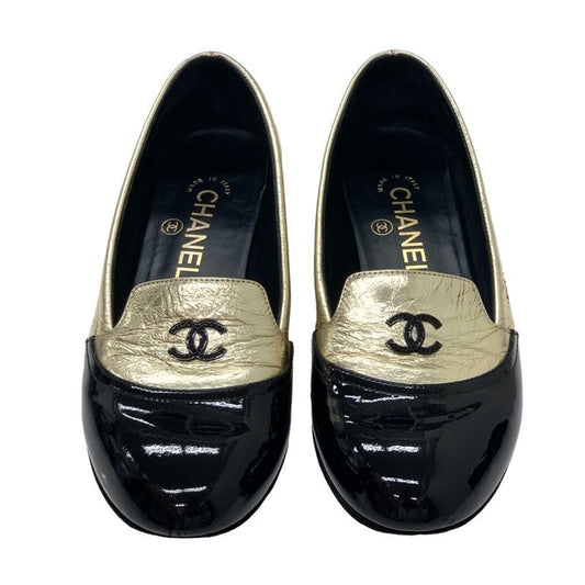 Chanel Loafer Leather Shoes Heremark Leather Patent Gold Black