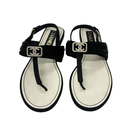 Chanel Sandals Shoes Satin Black Gold Here Mark Rhinestone Thong Flat