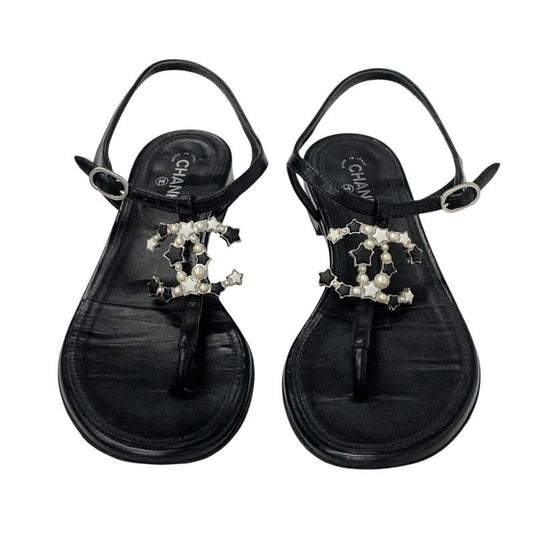 Chanel Sandals Shoes Leather Black Silver Coco Mark Star Pearl Strap Thong